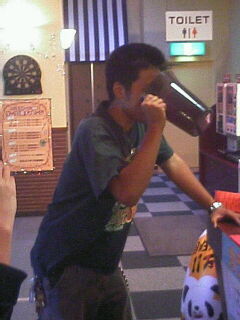 レジの脇にあるダーツで宣言した所に入れる事が出来たら『水を一杯だけ飲んで無料券を使ってもいいよ』という事になった。