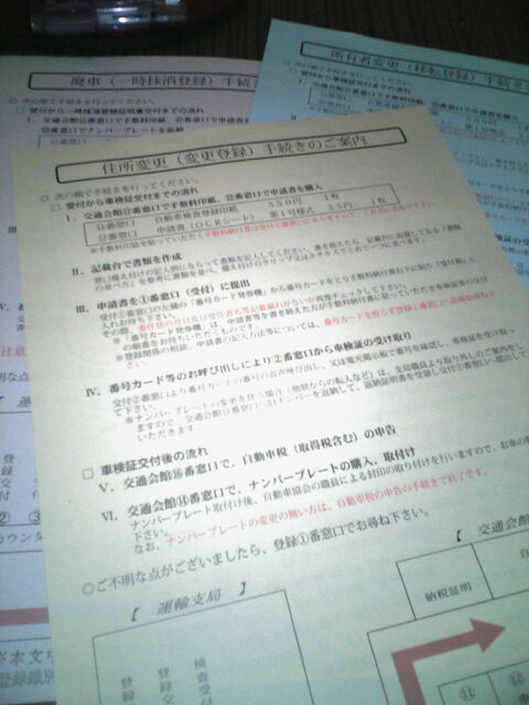 ネットで調べた必要書類を渡したのだが、本人が手続きに来た場合は省略出来るらしく、車台番号とナンバーがわかれば登録出来るらしい。