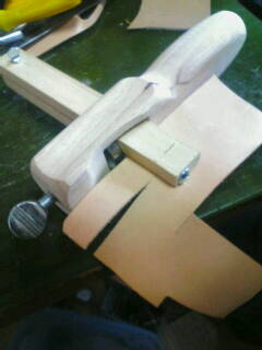 これはストラップカッターという道具で、革を同じ幅に切っていく事が出来る道具である。