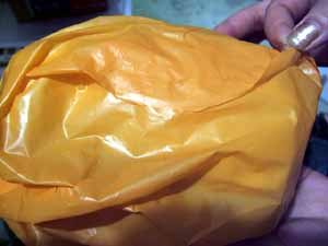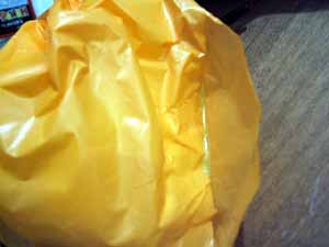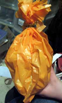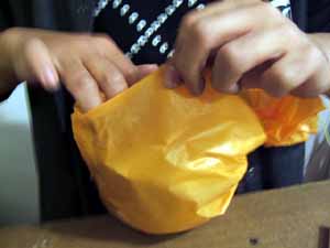 「袋の中に手が入ってるけど、ここが開ける所じゃないの。開ける所は右側の絞ってあるところなんだよ。」